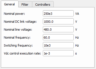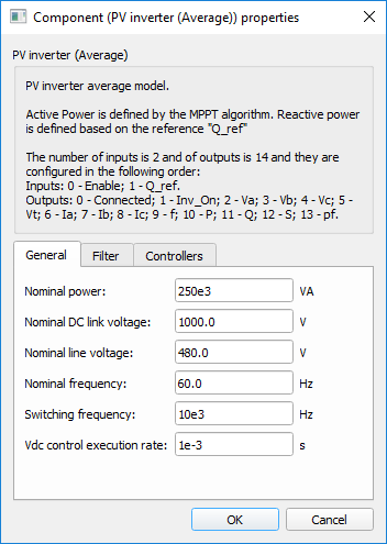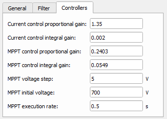 In this component tab, you can specify controller parameters of the PV inverter model.
