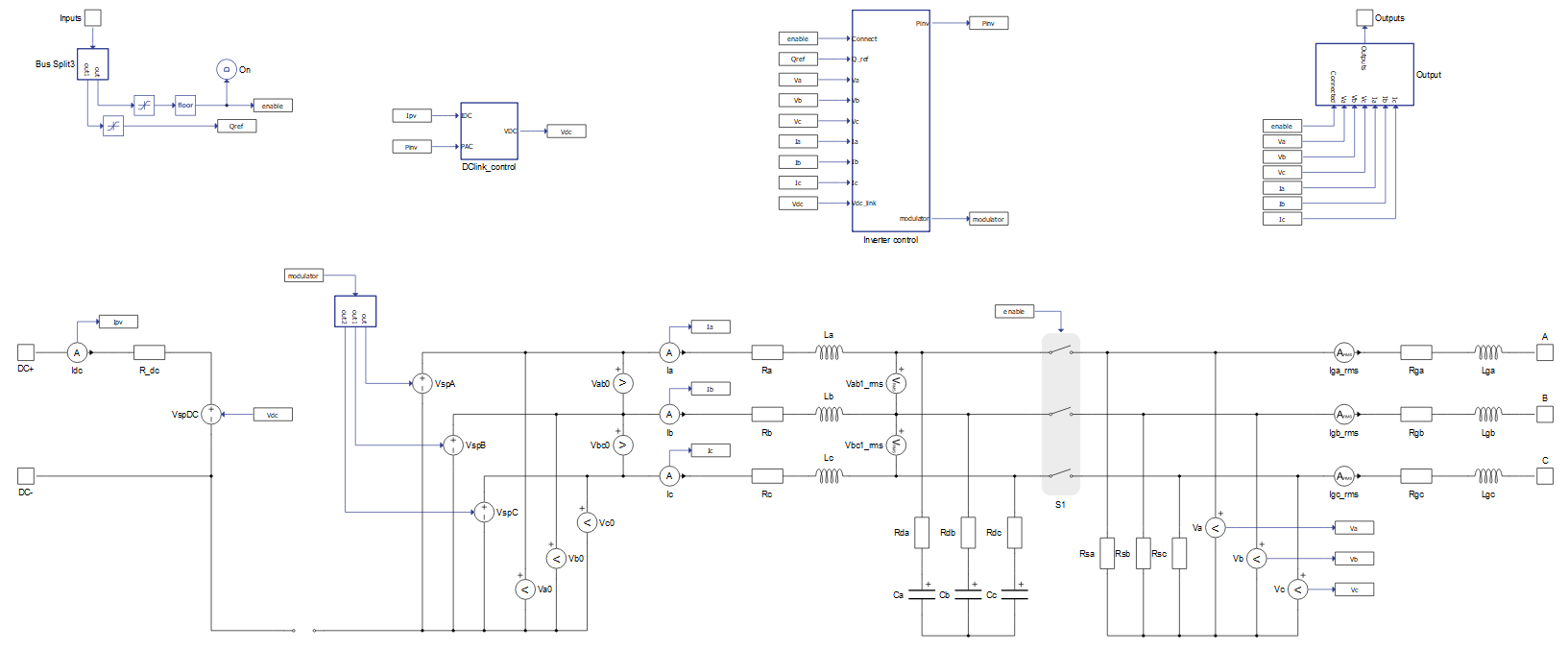 The PV inverter model has 14 outputs. They are organized as an array and can be accessed individually through a Bus Split component, respecting the correct order. Table 3 describes the outputs and their order.