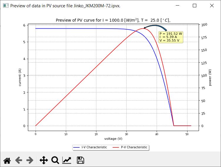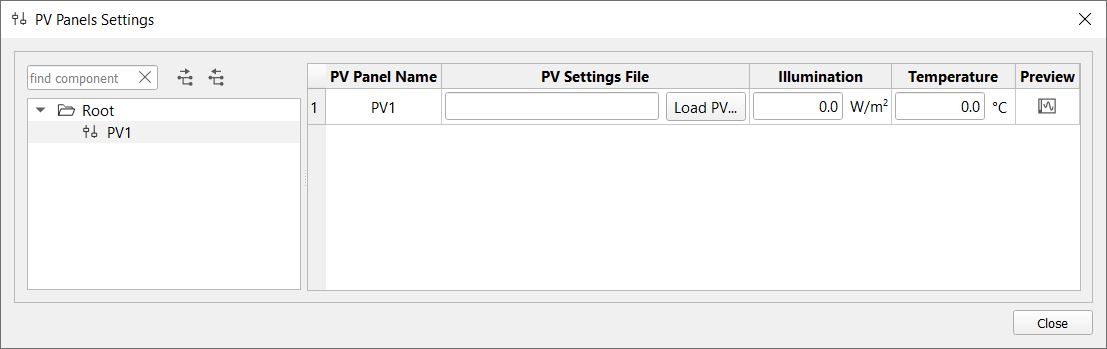 You can assign a PV panel file (.ipvx extension) to all photovoltaic panel elements in the model. PV panel files are generated using the Waveform Generator tool. You can set irradiance and temperature values for each panel individually. Irradiance and temperature can be changed during the simulation run-time.