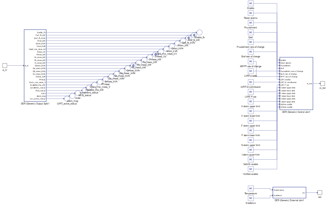 All these signals are also defined in the corresponding PV Power Plant (Generic) UI subsystem with built-in Probe components (for output signals) and SCADA Input components (for input signals), as shown in Table 5. These signals were split and joined by properly configured DER (Generic) Output Split and DER (Generic) Control Join components. The PV Power Plant (Generic) UI subsystem is located in the same place in the Schematic Editor library as the PV Power Plant (Generic) component, and it can be unlinked from the library and adopted to the specific needs. Unit [pu] is associated to nominal values, which are either inserted as general tab parameters or derived from them.
