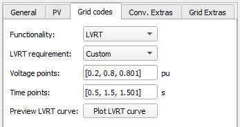 | LVRT requirement | lvrt_req | Automatically parametrizes voltage and time points according to the chosen requirements. If the Custom option is selected, voltage and current points become available for editing. |