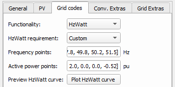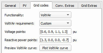 In this component tab, different Grid code parameters can be specified. Currently, LVRT (Low Voltage Ride Through), VoltVAr, HzWatt, and VoltWatt functionalities are supported.