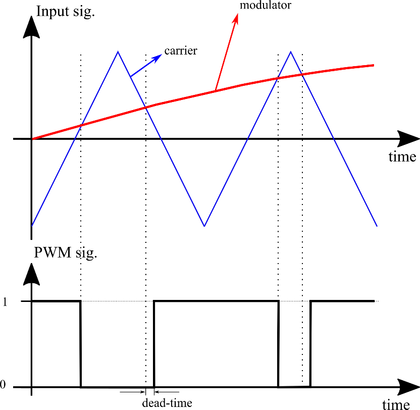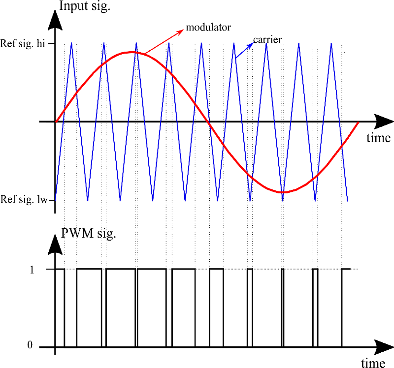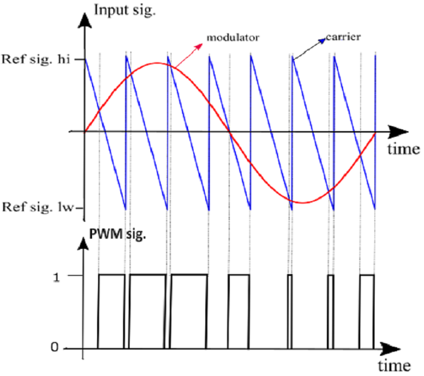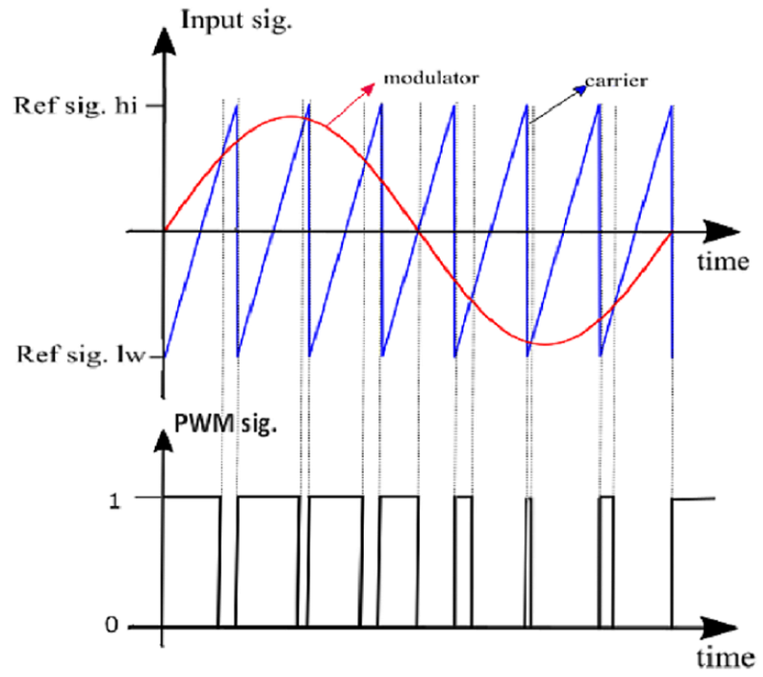 Figure 4 illustrates a PWM signal generated through the comparison between the reference (modulator) signal and the sawtooth-falling carrier signal.