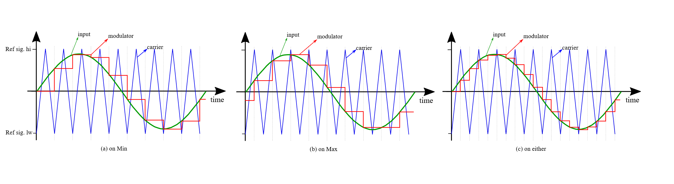 For a tirangle carrier with fixed carrier frequency it is possible to specify when the modulating signal will be updated with the input value, based on the carrier value. The modulating signal can be updated when the carrier reaches its minimum, maximum or either value. Figure 1 shows the different behaviors of the load modes.