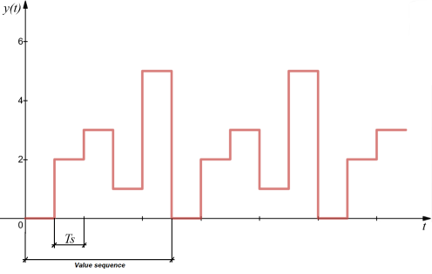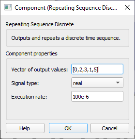 The Repeating Sequence Discrete component outputs and repeats a custom value sequence.