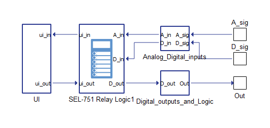 The SEL-751 Relay Logic component has 3 inputs - Relay input from the User Interface (ui_out), Relay analog input (A_in), Relay digital input (D_in) - and 2 outputs Relay digital output (D_out) and Relay output to the User Interface (ui_in).