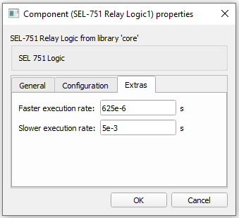The faster execution rate is the rate at which RMS values are calculated using a one-cycle cosine filter. By default this value is set to 625 us, which implies 32 samples per power system cycle (50 Hz) and it matches the real SEL-751 Relay. In this model, the Faster execution rate value can be changed in order to adapt the component to the other execution rates in the model if necessary. The cosine filter will work with a different number of samples depending on the execution rate. The minimum Faster execution rate is 500 us. The Slower execution rate is the rate at which protection functions are executed, which is set to four times faster than the power system cycle by default. The Slower execution rate can also be changed and adapted to other execution rates in the model. Changing the execution rates of the SEL-751 Relay Logic can produce small differences in dynamic responses relative to the default values.