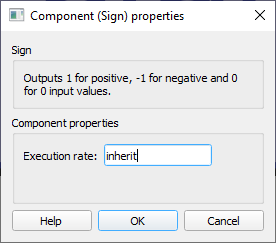 - Type in the desired signal processing execution rate. This value must be compatible with other signal processing components of the same circuit: the value must be a multiple of the fastest execution rate in the circuit. There can be up to four different execution rates. To specify the execution rate, you can use either decimal (e.g. 0.001) or exponential values (e.g. 1e-3) in seconds. Alternatively, you can type in ‘inherit’ in which case the component will be assigned execution rate based on the execution rate of the components it is receiving input from.
