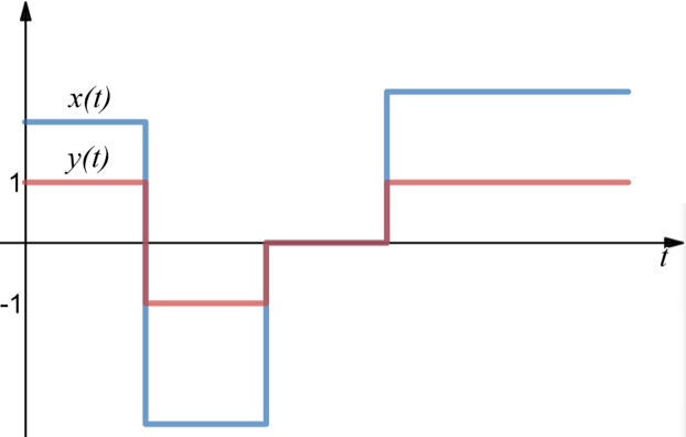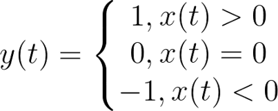 If the input signal is positive, returns the value 1. If the input signal is negative, returns the value -1. If the input signal is zero, returns the value 0.