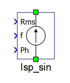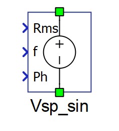 Single Phase Signal Controlled Sinusoidal Sources (voltage and current) have two electrical ports for connecting with the electric circuit and three signal processing input ports. Values of the signal controlled sinusoidal source are defined through signal processing input ports. The Rms input defines the RMS value, the f input defines the frequency, and the Ph input defines the initial phase of the desired sinusoidal signal.