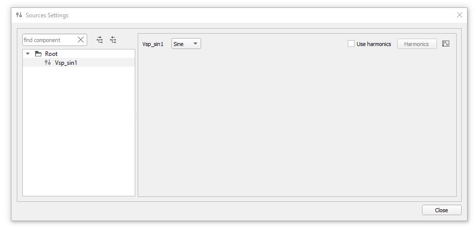 In HIL SCADA, independent sources can be specified in the sources section of the Model settings (Figure 3). The harmonics of the signal controlled sinusoidal source can be specified by clicking the Harmonics button of the corresponding source, which opens the Harmonics settings window (Figure 4).