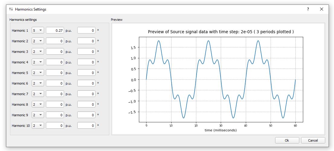 The Preview of the source waveform displays the specified higher harmonics when applied to a per-unit representation of the source waveform with a sample fundamental frequency of 50 Hz.