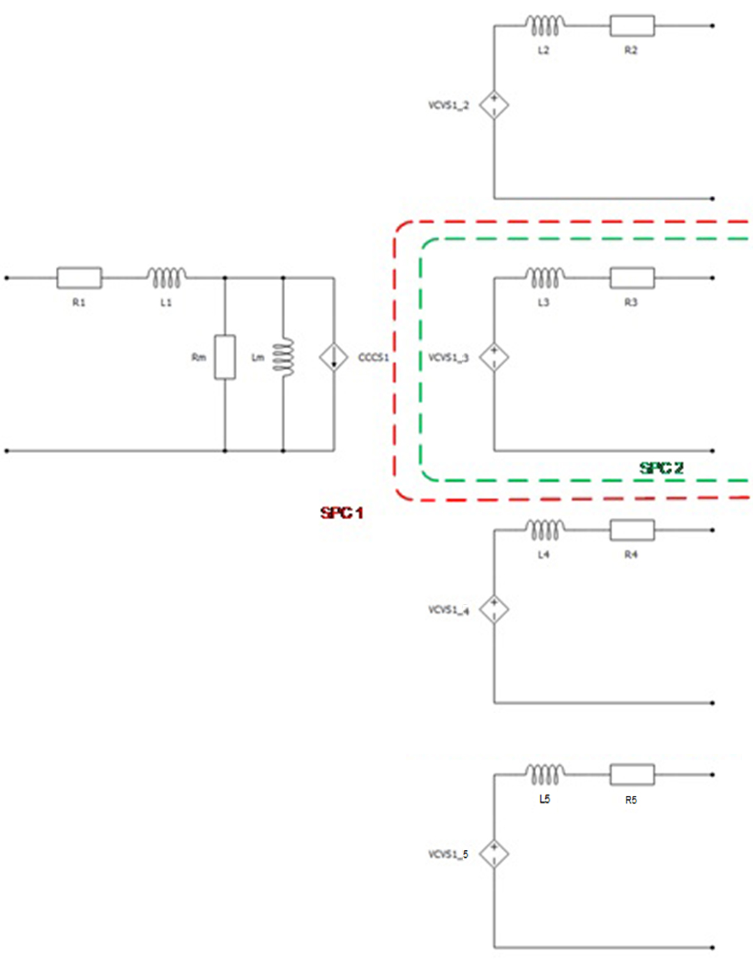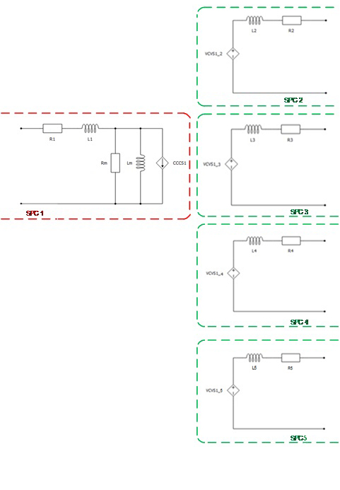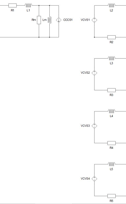 The Single Phase Multi-Winding Transformer component models two to ten coupled windings on the same core. The magnetization inductance Lm can be linear or with saturation, it is modeled on the primary side of the transformer. Core losses are modeled as Rm resistance located on the primary side of the transformer. Also, it is possible to neglect Lm and Rm by selecting Lm/Rm neglected in the Core model property. For more information, please refer to Core model.