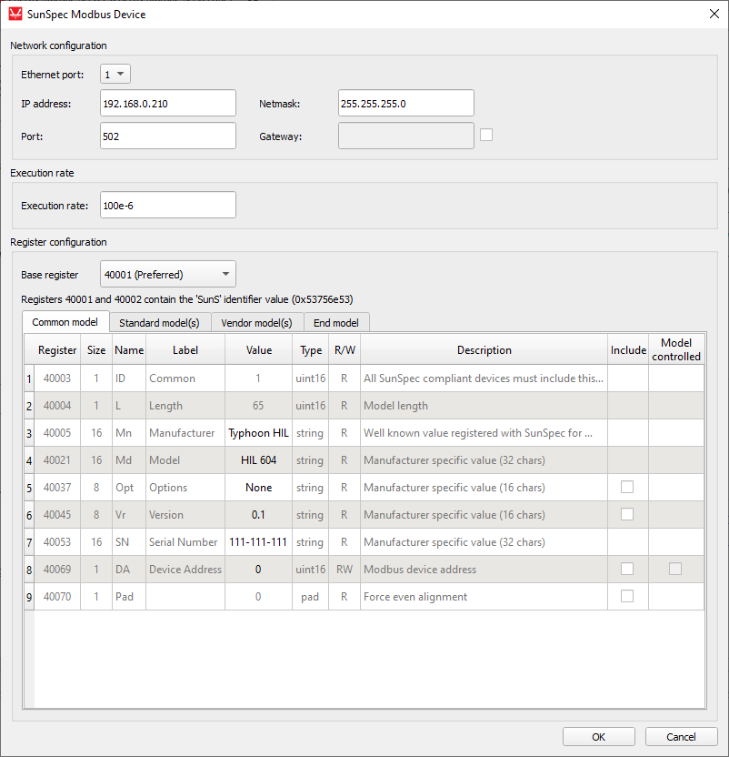 The SunSpec Alliance is a trade alliance of developers, manufacturers, operators and service providers, together perusing open information standards for distributed energy industry. The Information Models can be used to convey device data between any two communicating entities by mapping them to the communication protocol appropriate for the entities. The Modbus mapping is used in Typhoon HIL toolchain, hence the SunSpec Modbus name