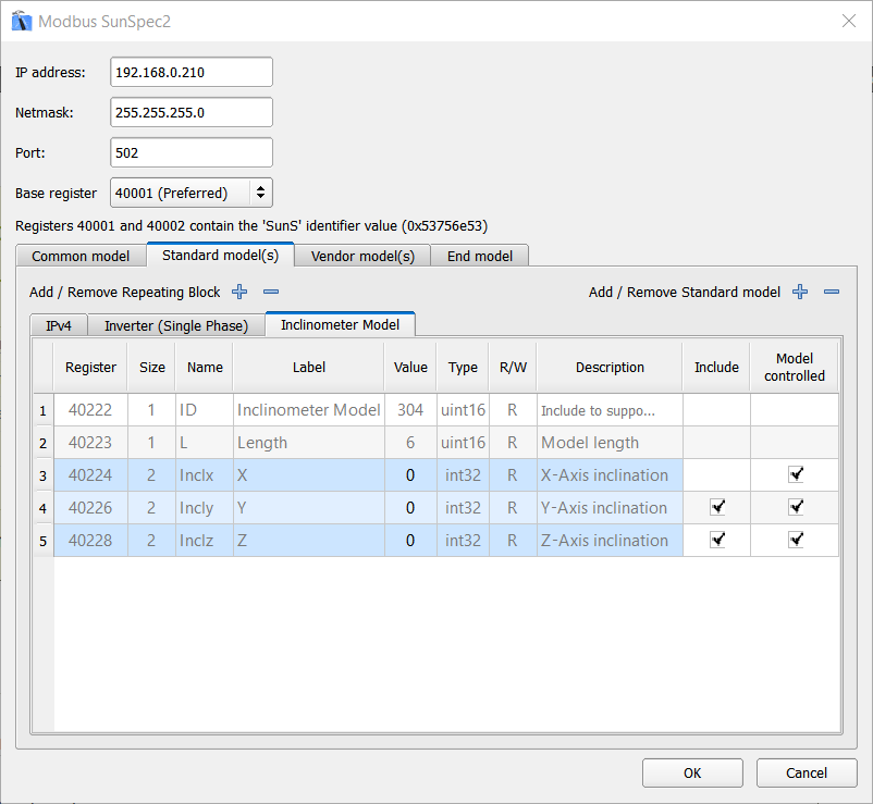 After opening a components dialog window (SunSpec Modbus Device dialog window), two parts of the server can be defined, the communication part and the register part.