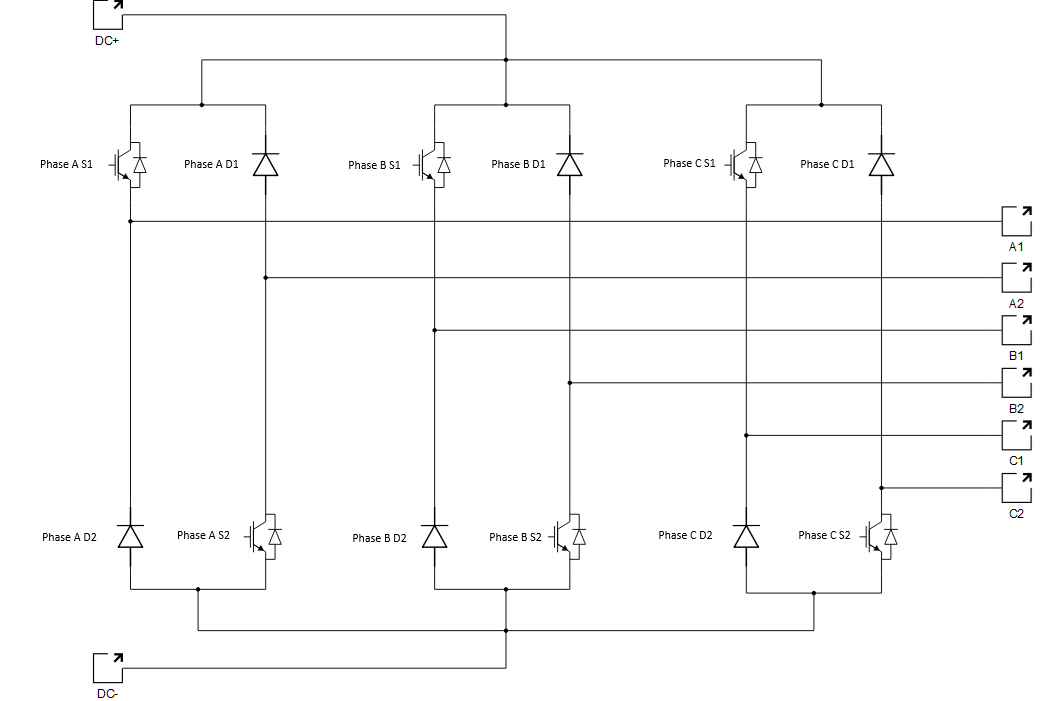 Selecting Model as the Control parameter, enables IGBT gate drive signals to be set up directly from the signal processing model. The input pin s_ctrl appears on the component and requires a vector input of six gate drive signals in the following order: [Phase A S1, Phase A S2, Phase B S1, Phase B S2, Phase C S1, Phase C S2]. When controlled from the model, logic is always active high.