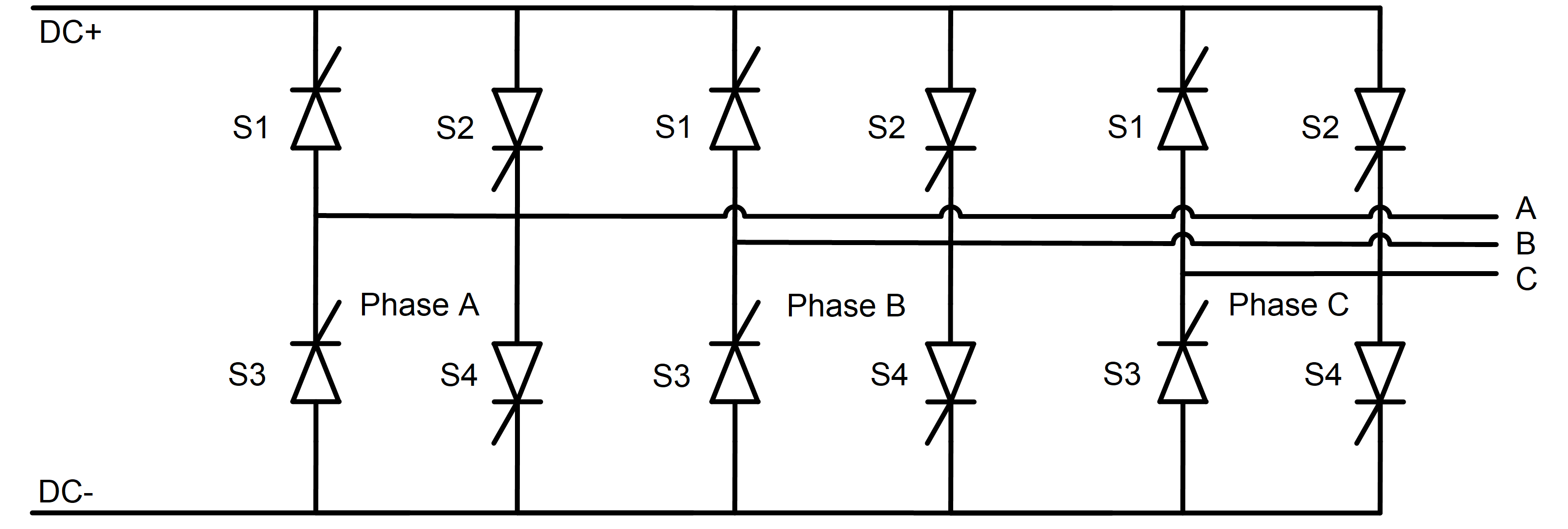 A schematic block diagram of a three-phase to single-phase cycloconverter block is given in Figure 2 with corresponding thyristor arrangement and naming.