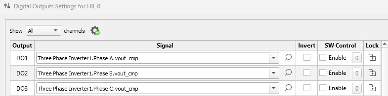 Output Voltage Comparator signals are available in the digital signal list of models that contain Three Phase Inverter components. One such signal is generated for each Half Bridge used in the model, under the name "component_name.Phase X.vout_cmp", where component_name is the Three Phase Inverter's component name in Schematic Editor, and x is the designator of a particular phase (A, B or C).