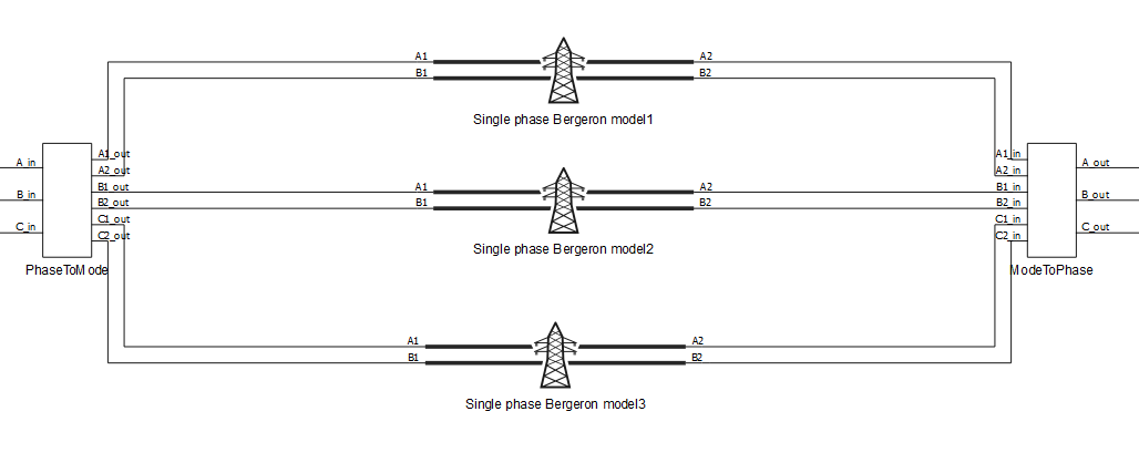The calculations previously done in Single Phase Bergeron Model are made in the modal domain before being converted back to phase values.