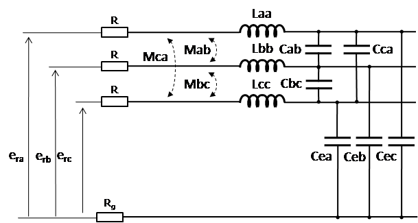 Representation of the lossless three phase power line can be expanded to model losses by adding series conductors' resistances and ground resistance.