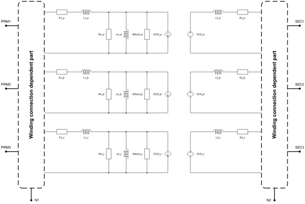 It should be noted that terminals N1 and N2 can be connected with the rest of the circuit in Schematic Editor only if the corresponding side is wye (Y) connected.