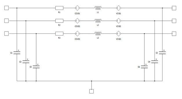 If Model definition is set to RLC, transmission line R, L, and C parameters are defined by the user as per length matrices in the phase domain. Phase domain parameters are defined as nested python lists [[L11, L12, L13], [L21, L22, L23], [L31, L32, L33]], where diagonal elements represent self-inductances of each phase, and off-diagonal elements represent mutual coupling inductances between phases. Number of elements in the nested lists are defined by the Number of phases parameter.
