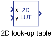 Two-dimensional Lookup table generates an output signal by interpolating based on a given data set and two input values: input values x and input values y. The Input values x and the Input values y properties must be strictly increasing or decreasing arrays.