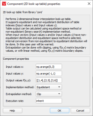 Description of the two-dimensional look-up table component, which generates an output signal by interpolating based on a given data set and two input values.