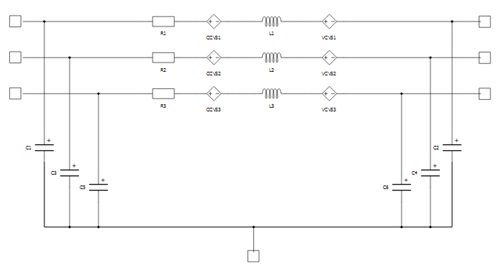 If Model definition is set to RLC, transmission line R, L, and C parameters are defined by the user as per length matrices in the phase domain. Phase domain parameters are defined as nested python lists [[L11, L12, L13], [L21, L22, L23], [L31, L32, L33]], where diagonal elements represent self-inductances of each phase, and off-diagonal elements represent mutual coupling inductances between phases. Number of elements in the nested lists are defined by the Number of phases parameter.