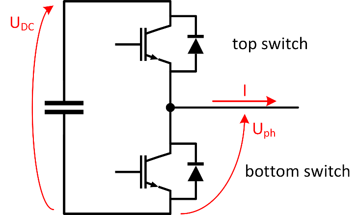 The Output Voltage Comparator's value is determined considering the values of control inputs controlling the switches, the switching delay, the sign of the output current I and the input Udc and the output voltage Uph. This is represented in Figure 2 as a figure, and in Table 1, in a tabular form.