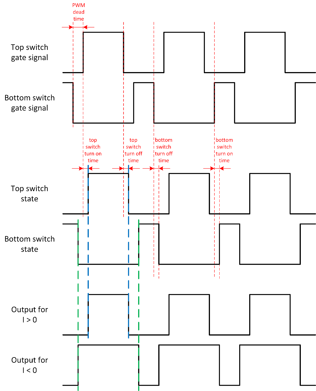 In order to minimize output latency, the output voltage comparator logic works in two distinct operating modes: active and coasting. The Vout comparator timeout property in the Three Phase Inverter component defines the time period that both GDS input signals in the given phase leg must remain at zero until the logic automatically switches into coasting mode. For optimal performance, the timeout should be set to a value that is slightly higher than the maximum expected dead time.