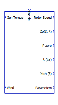 The Wind Turbine component contains a simplified model of the mechanical system and the aerodynamics of a wind turbine.