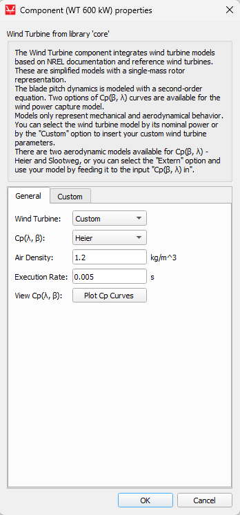 - Specify the simulation step (seconds) for the wind turbine component. As the mechanical/aerodynamic model contains only slow dynamics, large values like 0.005 s can be used.