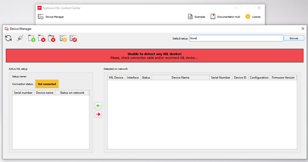 Once your drivers are successfully installed, start Typhoon HIL Control Center and check if your HIL device is detected by opening the Device Manager tool in the top left corner of the application. If detection is successful, you should be able to see your HIL device in the "Detected on network" section. If you instead get the message shown below, you must install the drivers manually. The procedure for manual driver installation is available in the Manual HIL USB Driver Reinstallation section of the USB connection to HIL Lost / Unable to detect HIL FAQ Guide.