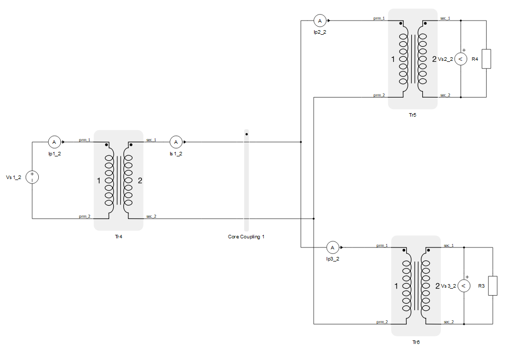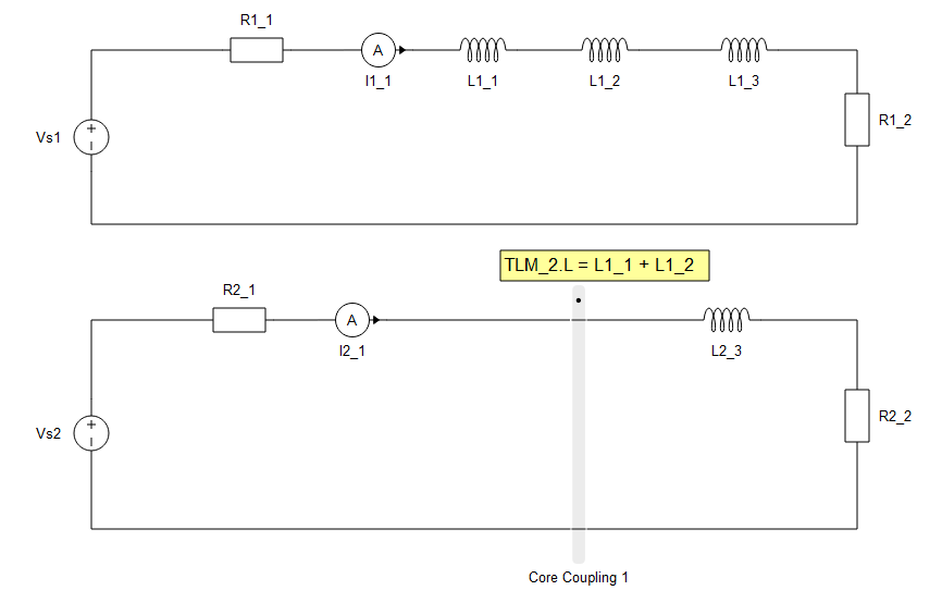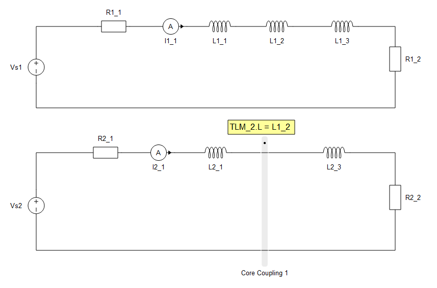 This pattern shows the basic principle of replacing existing inductor(s) with an inductive TLM link. This pattern can be used in every situation when a model contains inductor(s) in series with other elements. In this case, the inductor can be replaced with an inductive TLM single phase core coupling that has the same inductance as the replaced element. For example, in Figure 1, inductor L1_2 is replaced with a TLM coupling.