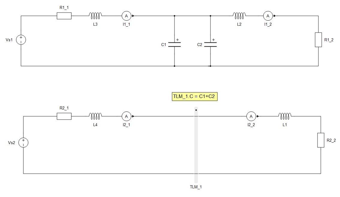 The capacitive TLM coupling element can be used in a similar way to inductive TLM coupling elements. The only difference is that capacitor needs to be in parallel with the other elements. Figure 3 shows an example where capacitors C1 and C2 can be replaced with a capacitive TLM link that has a capacitance equal to the sum of C1 and C2.