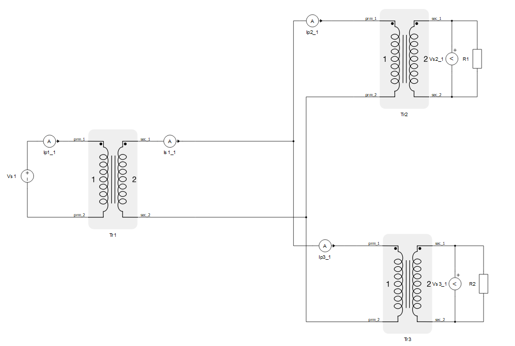 When using TLM coupling elements next to a transformer, the goal is to divide an inductor at one of the transformer winding. Then, next to the changed winding, an inductive TLM coupling is placed. The sum of the coupling inductance and the "new" winding inductance needs to be the same as original winding inductance. Figure 4 shows the original circuit that needs to be decoupled. As mentioned earlier, the secondary winding inductance L can be reduced to L/2. Then, the inductive TLM coupling component can be added next to the transformer winding. The corresponding TLM inductance needs to also be L/2. The described procedure is shown in Figure 5.