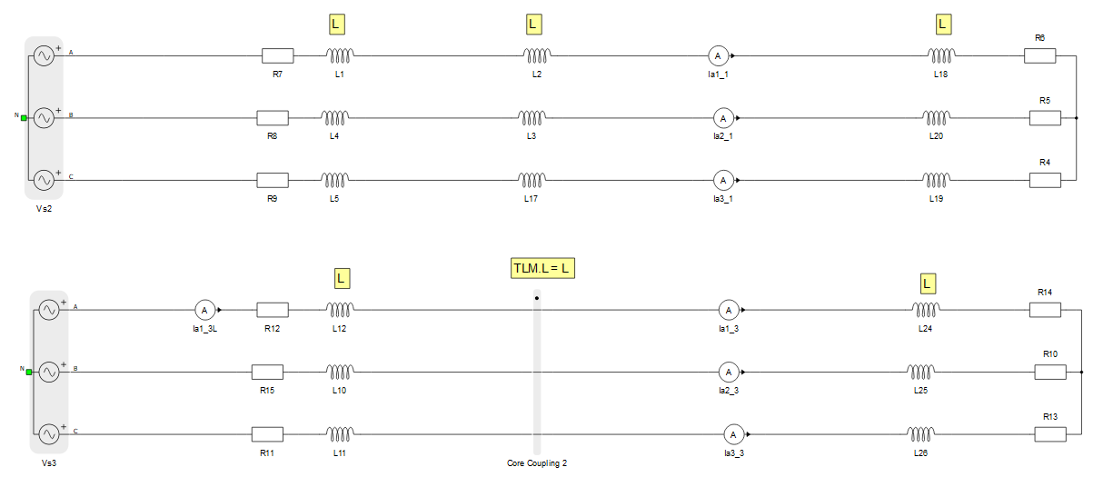Three phase TLM coupling is based on single phase TLM coupling. Therefore, there is no difference in usage recommendations. So, as in a single phase case, it is recommended to replace existing inductors (or capacitors) with a corresponding three phase TLM coupling element at that spot. Of course, the coupling inductance (capacitance) needs to be same as the inductance (capacitance) of the replaced element. Figure 6 shows one example of a three phase TLM coupling. Inductors labeled L2, L3, and L17 have an inductance L. They can be replaced with a three phase TLM core coupling element, with an inductance set to L. If inductances L2, L3, and L17 have different values, then a three phase coupling element must be implemented, combining the single phase TLM coupling components with different values.