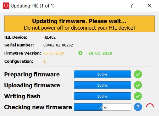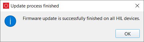 Select the desired HIL device and click on this action. Device Manager will find the appropriate firmware and start the update process automatically. Additional information on how this is performed is in the Syncing HIL Firmware in Device Manager section.