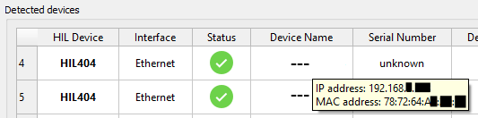 Hovering over a specific HIL device in the Detected devices window will reveal its IP address and MAC address.