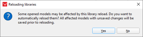 If a library which is currently edited is saved in a directory listed in the library search path, by using the Reload libraries action (File -> Reload libraries) you can refresh the Library Explorer tree and update all the models that use the library. If there are open libraries or models affected by this reload, you will have the option to reload them automatically via the popup menu.