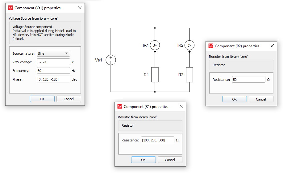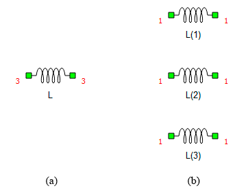 The values of the properties of those new inductors depend on how the original vectorized inductor was defined. Consider the example in Figure 2. All properties in (a) are defined as scalars, while the Inductance property in (b) is defined as a vector (Python list). In case (a), the inductor will be vectorized only if connected to a bus (it also inherits the bus size), and the resulting scalar inductors will have their properties equal to the original inductor. In case (b), the three resulting inductors have their Inductance property set as 1e-3, 2e-3, and 1e-3 (in order), and their Initial current as 1.