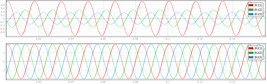 With this parametrization, the Vs1 source becomes effectively a three-phase sinusoidal source. The waveforms of the current measurements, which can be seen in Figure 4, show the phase delay between the currents. The different resistance values on each phase of the R1 resistor produce currents of different amplitudes, while R2 maintains the same value across phases.