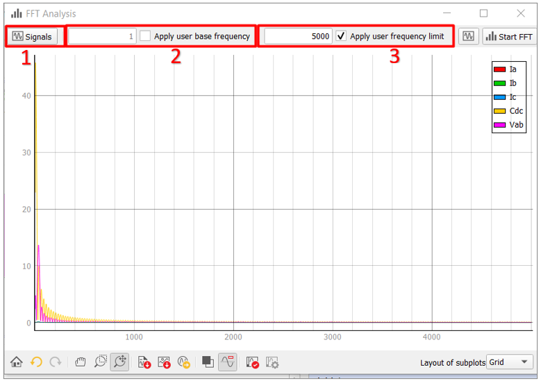 - Frequency limit settings (an input field and a checkbox) - checking the Apply user frequency limit will apply FFT with the frequency limit set by the user in the input field to the left of the checkbox.