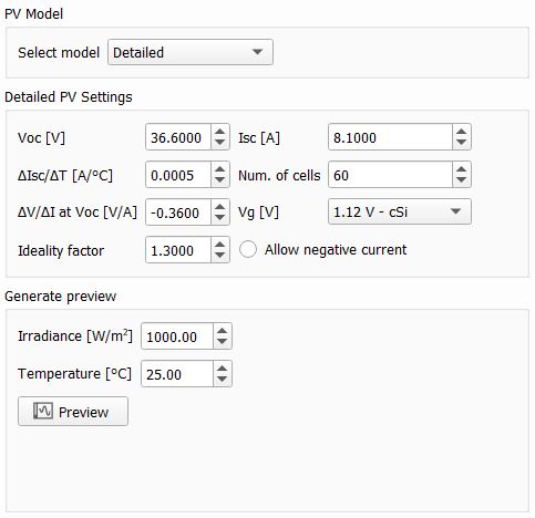 Detailed PV file settings (Figure 1) are by default preconfigured with standard data-sheet PV panel parameters. In case the allow negative current option is checked, the PV panel will behave as if there were no blocking diode.