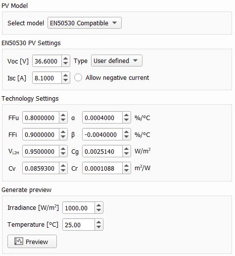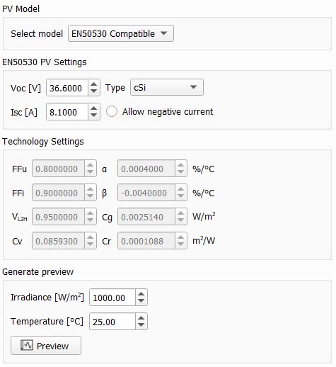 You can use three PV Model types: Detailed, EN50530 Compatible, and Normalized IV.