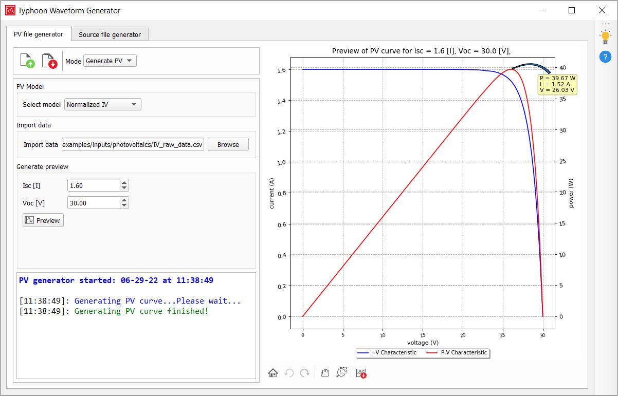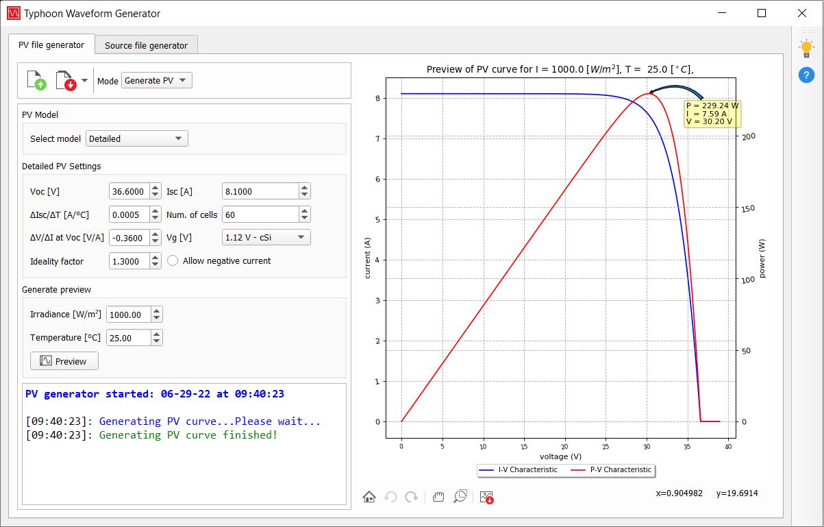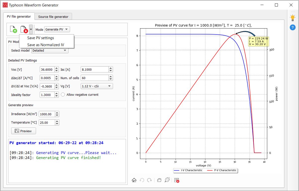 After all the PV panel parameters are set, press the Preview button. The PV file generator will display a calculated PV panel I-V curve (Figure 4) based on the PV panel parameters and the selected irradiance and temperature values.