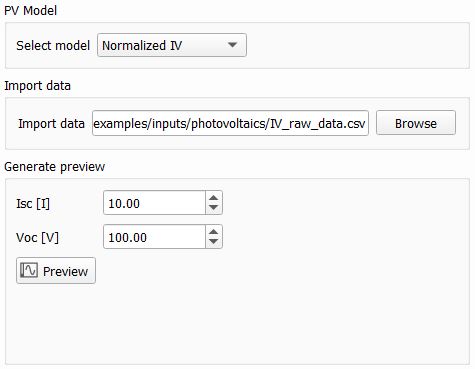 The Normalized IV PV model type is used to create PV file settings which consists of x- and y- data sets, representing an arbitrary I-V curve. Data points are specified in an imported .csv (comma-separated values) file.