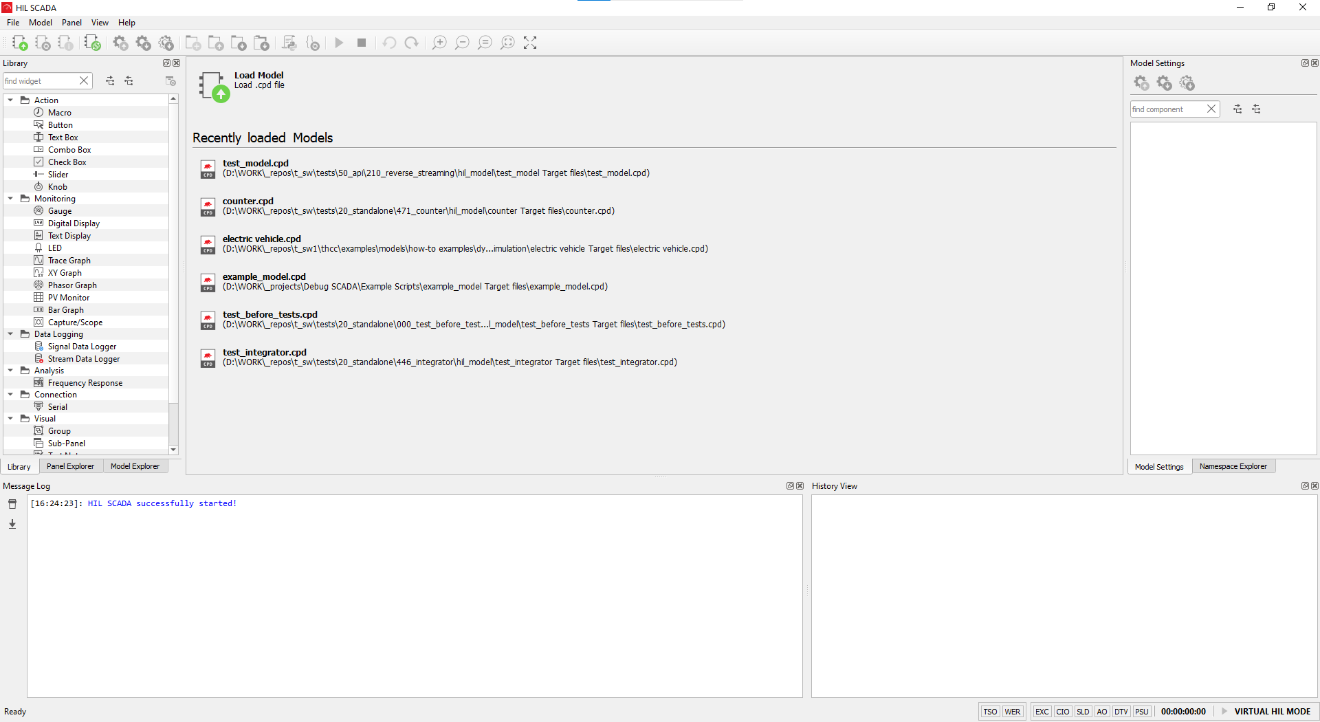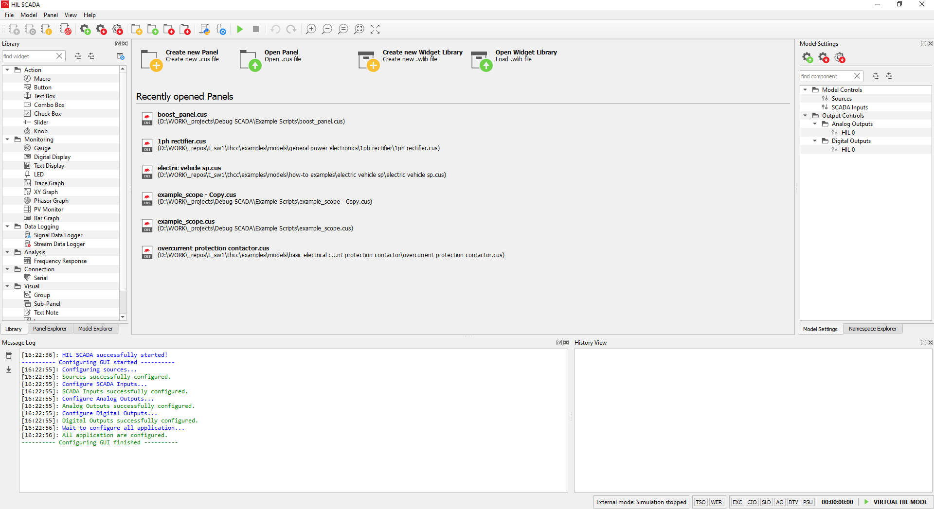 HIL SCADA External mode is a special mode of operation of the HIL SCADA application. In this mode, SCADA can be connected to a model which is controlled externally, usually by a test script which is using the client library in order to call API functions. In this mode of operation it’s possible to observe and change simulation variables just as you would in HIL SCADA.