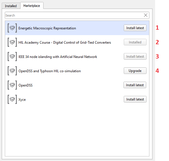 If the package is not available for the current version of Typhoon HIL Control Center, the installation button will be disabled (3 - Figure 2).